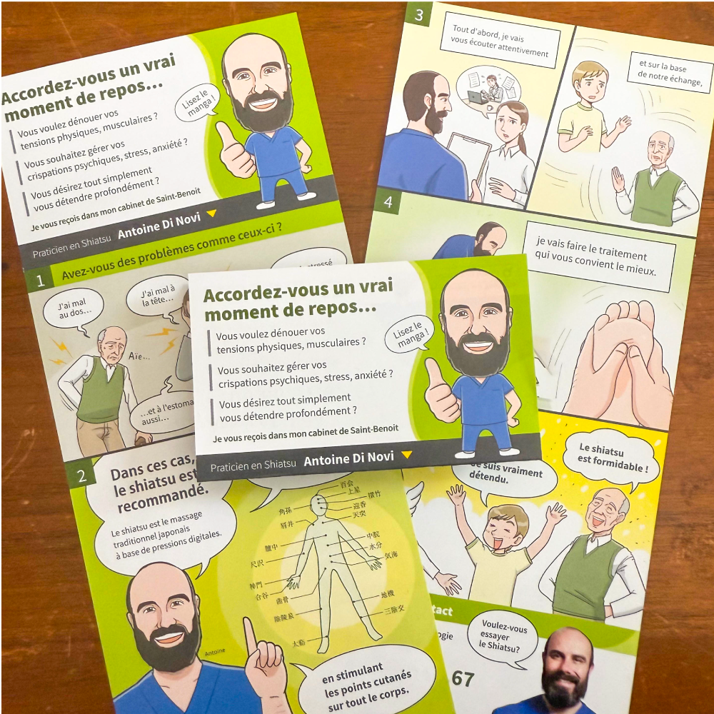 Passionate about drawing manga from an early age, Kitade studied design in high school and, after graduating from Tokyo Designer Academy, joined a creative company specializing in editorial and advertisement design. After gaining nine years of professional experience, he established KITADESIGN in 2008. With the launch of his own studio, he returned to drawing manga, combining his illustration and advertising skills to create Manga PR Flyers. With the success of the Manga PR Flyers, he expanded his services to Manga PR Brochures, Manga PR Websites, and Manga Business Cards and his works have been featured in design-focused publications. His client network now spans more than 400 companies across Japan and France. Kitade continues to share his vision of expanding Manga advertisement to the world.